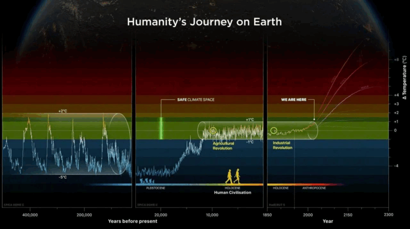 Pictorial summary of Humanity’s journey on Earth – Human population size and global temperature from 500 000 years before present until 2100. Source: Planetary Health Check 2025 Report.