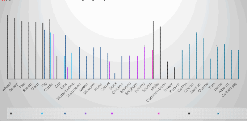 Summary of the earliest signs on the domestication of crops and livestock in different regions across the globe. Data used sourced from Herrera et al., “The agricultural revolutions.” As a chapter in Ancestral DNA, human origins, and migrations (2018): 475-509. Graphical representation by Author: Ndeke Musee