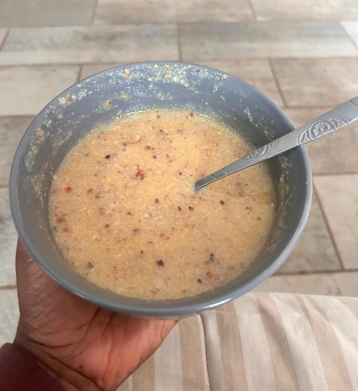 The pap is made from fermented maize meal for a day or two, depending on the weather. “When I miss that meal, I usually prepare sour pap by adding vinegar while cooking.”