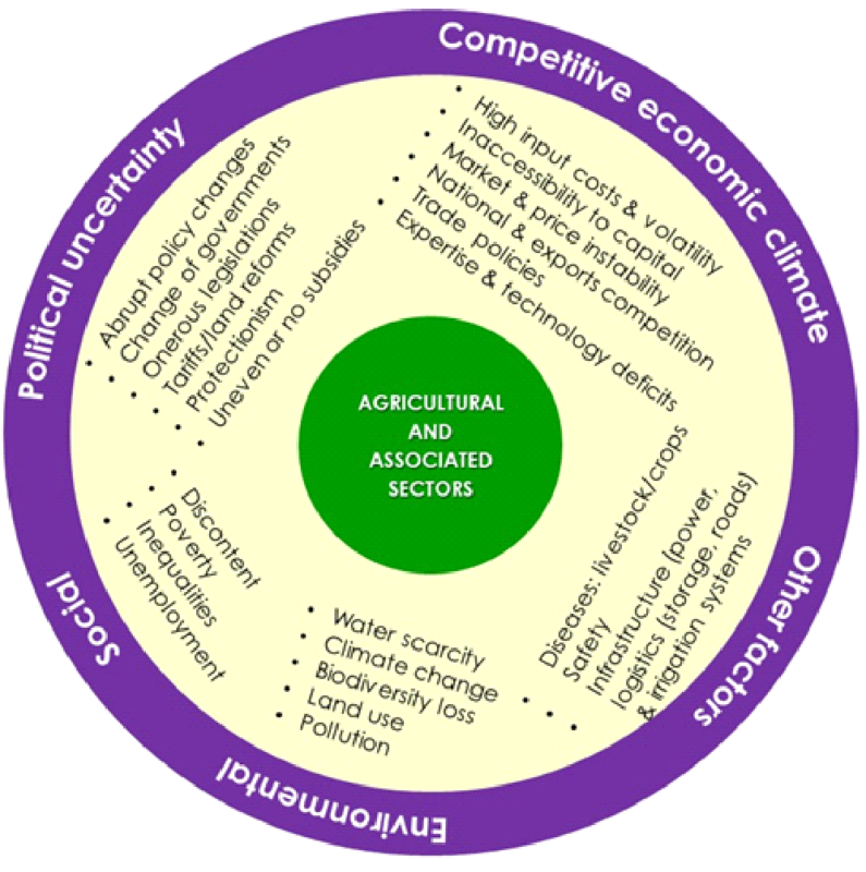 Framing and summary of challenges in the South African agricultural and associated sectors from farm to folk. The outer ring outlines the five aggregated challenges. The inner ring set outs 24examples of sub-challenges under each main challenge. Figure © by Ndeke Musee